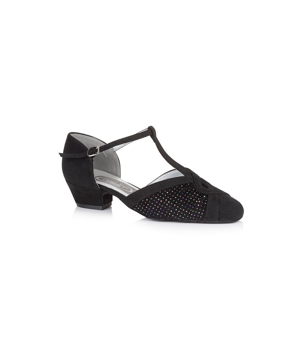 A closed toe social dance shoe with an open waist and a T-Bar. While stocks last! E Fitting.