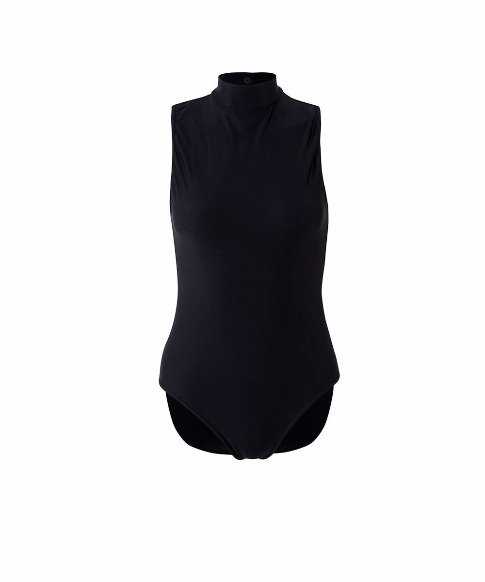 Sleeveless leotard with high neck and keyhole back.