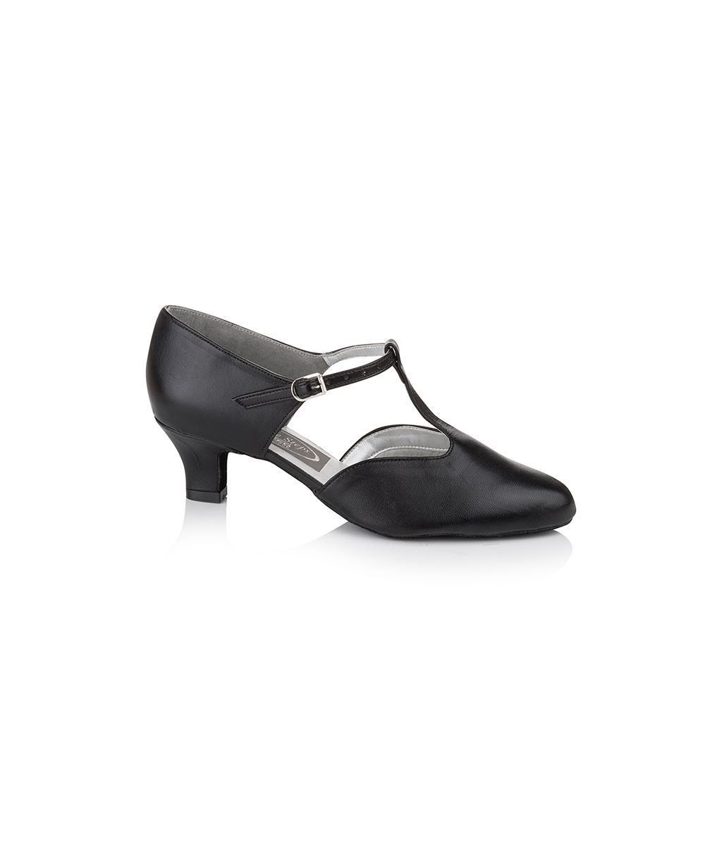 A closed toe leather shoe with contrasting T-bar and vamp detail. E Fitting.