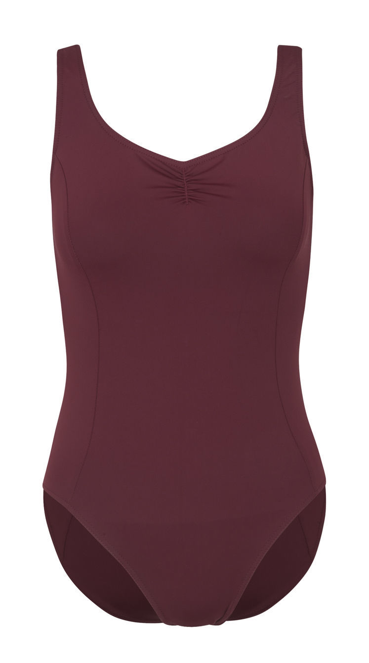 Sleeveless leotard with ruches and princess seams to front and back. Bralet lined from size 2 upwards.