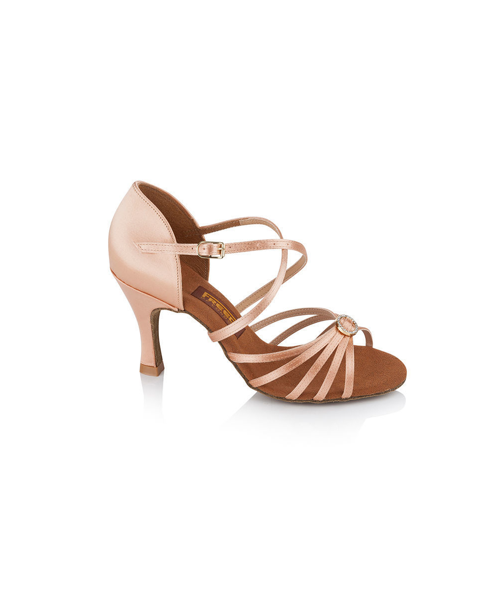 Gabriella latin sandal in satin, 4 strip sunray vamp, side cut outs and diamante buckle. While stocks last!