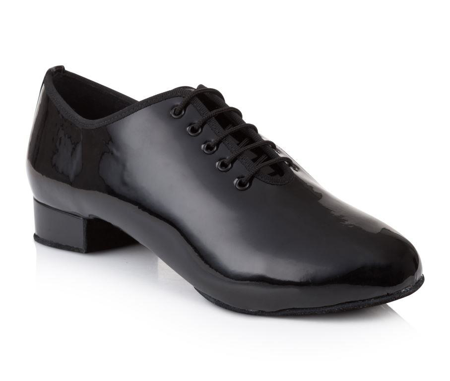 A split sole patent shoe designed in collaboration with professional ballroom dancer Tomas Mielnicki that features flexible elasticated side panels and a lipped heel.