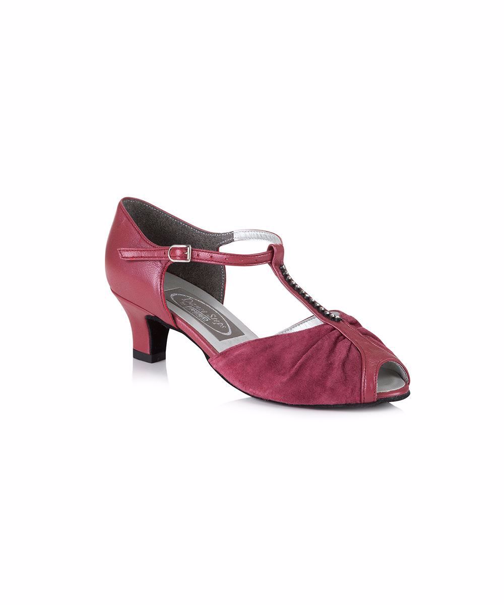 A closed toe social dance shoe with an open waist and a T-Bar. While stocks last! E Fitting.